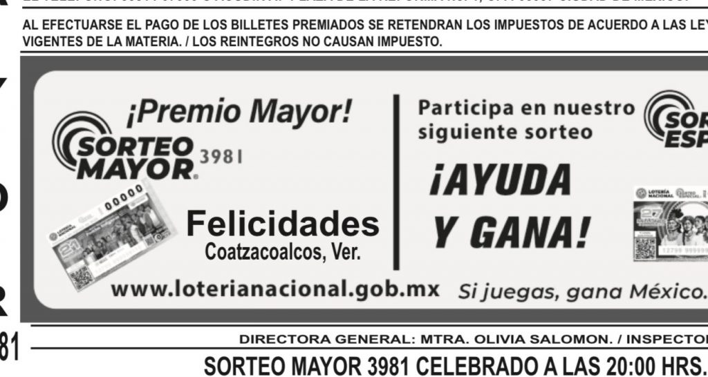 El boleto ganador del Sorteo Mayor fue el 3981, el premio era de 21 millones de pesos que se dividió en tres series, es decir, 7 millones de pesos cada una.