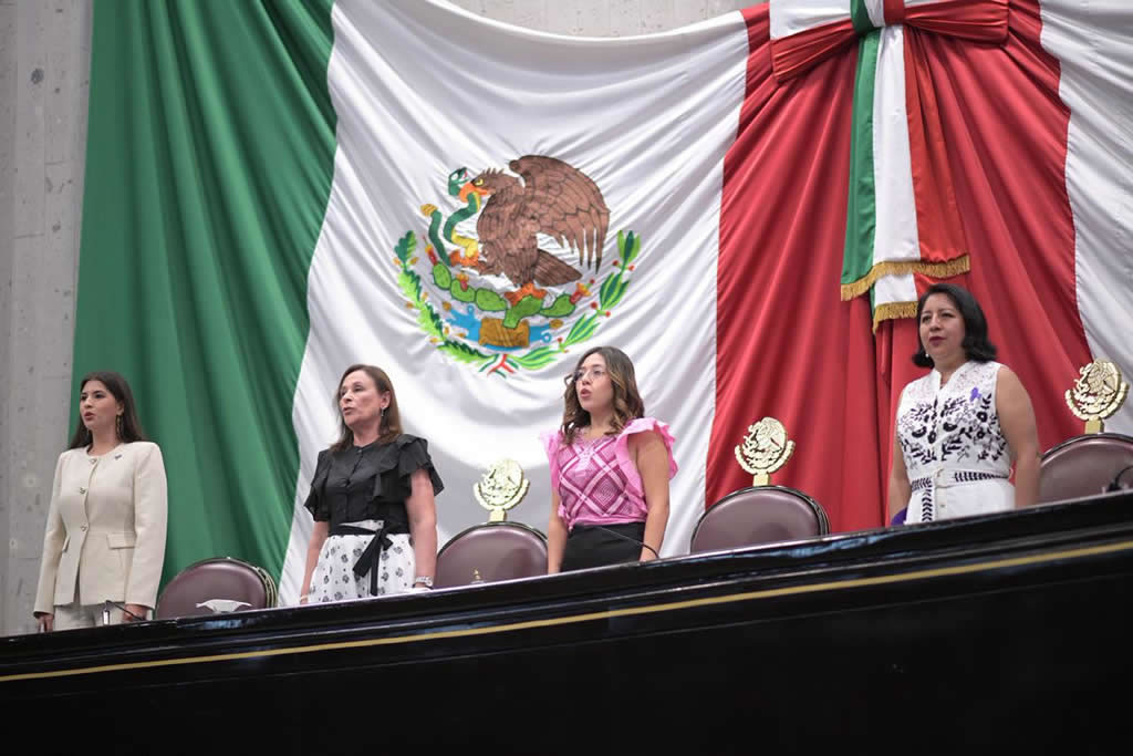 En el Recinto Oficial del Palacio Legislativo y con la asistencia de integrantes del gabinete estatal, presidentas y presidentes municipales, representantes de organismos autónomos y de organizaciones civiles y público en general, la presidenta de la Mesa Directiva, diputada Naomi Edith Gómez Santos, instruyó a las comisiones de cortesía recibir a las titulares de los poderes Ejecutivo y Judicial y a la condecorada.