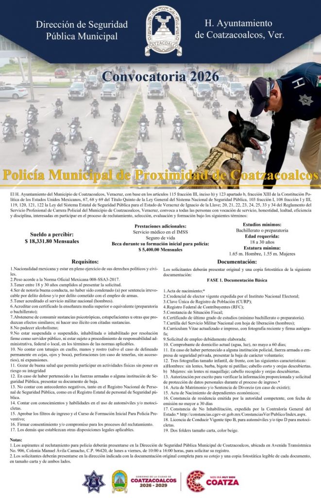 El Gobierno Municipal de Coatzacoalcos, a través de la Dirección de Seguridad Pública Municipal, lanzó la convocatoria 2026 para el reclutamiento, selección, evaluación e integración de nuevos elementos para la Policía de Proximidad de Coatzacoalcos.