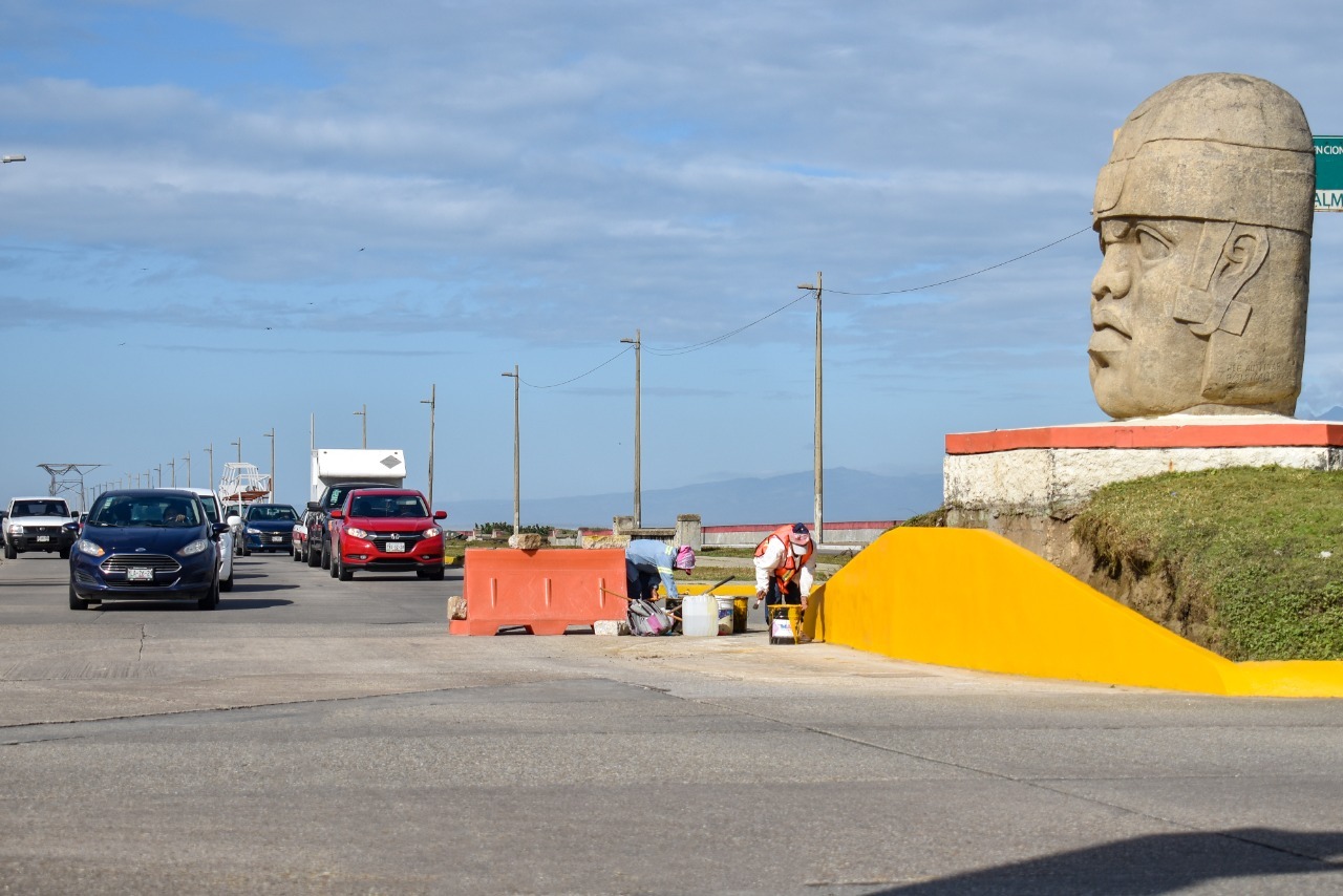 El Ayuntamiento de Coatzacoalcos atiende las peticiones de los ciudadanos que transitan por el Malecón Costero, al ampliar el carril izquierdo de alta velocidad en el cruce de la avenida Las Palmas y reducir el diámetro de la glorieta donde está ubicada la cabeza Olmeca.