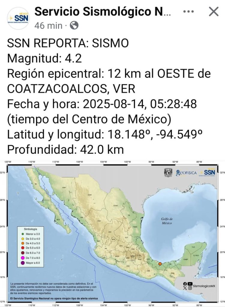 Se registró el décimo sismo en Coatzacoalcos durante 2025, en esta ocasión la magnitud fue de 4.2 a 12 kilómetros al oeste de la ciudad.