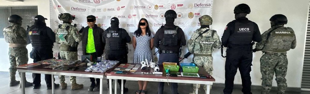 Además, cámaras de videovigilancia, una tablet, una terminal bancaria, tarjetas bancarias, dinero en efectivo, un DVR, teléfonos celulares, básculas y pipas de cristal; un tanque de gas estacionario y dos tanques de gas LP; una camioneta con reporte de robo, dos camionetas sin reporte y una motocicleta con el NIV alterado.