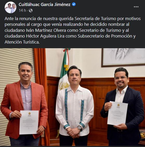 “Ante la renuncia de nuestra querida Secretaria de Turismo por motivos personales al cargo que venía realizando he decidido nombrar al ciudadano Iván Martínez Olvera como Secretario de Turismo y al ciudadano Héctor Aguilera Lira como Subsecretario de Promoción y Atención Turística”.