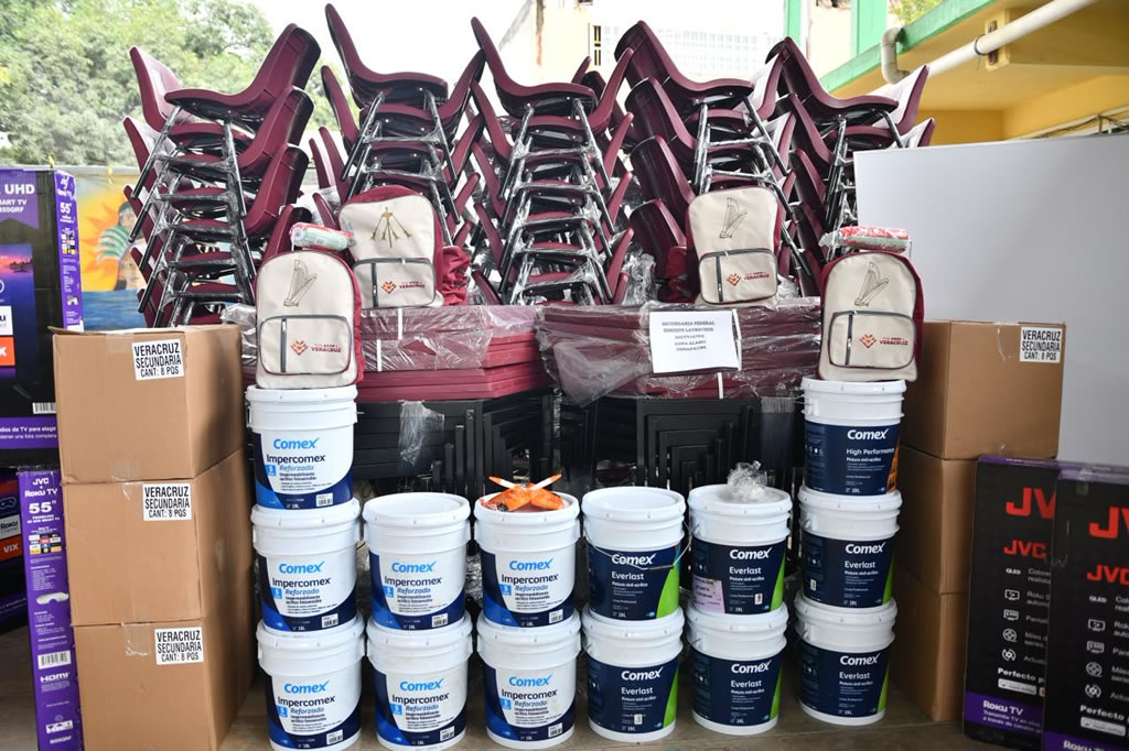 En total, 15 secundarias de Poza Rica recibieron 2 mil 257 kits escolares, mil 421 sillas, 710 mesas, 183 cubetas de impermeabilizante, 131 cubetas de pintura de 19 litros, 113 pizarrones, 47 pantallas de 55 pulgadas para 11 telesecundarias, así como 30 brochas y 30 rodillos, destinados al mejoramiento de las condiciones de los planteles.