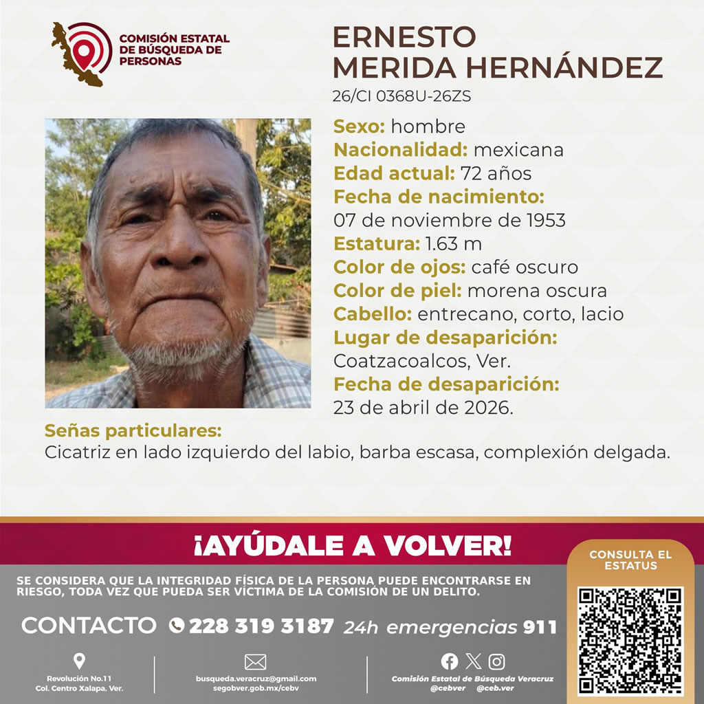El Sistema DIF Coatzacoalcos se suma a la búsqueda de ERNESTO MÉRIDA HERNÁNDEZ de 72 años de edad, que fue reportado desaparecido ante la Comisión Estatal de Búsqueda de Personas Veracruz, desde el pasado jueves 23 de abril de 2026 en el municipio de Coatzacoalcos, Veracruz.
