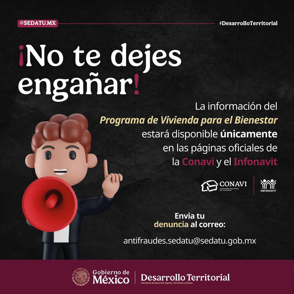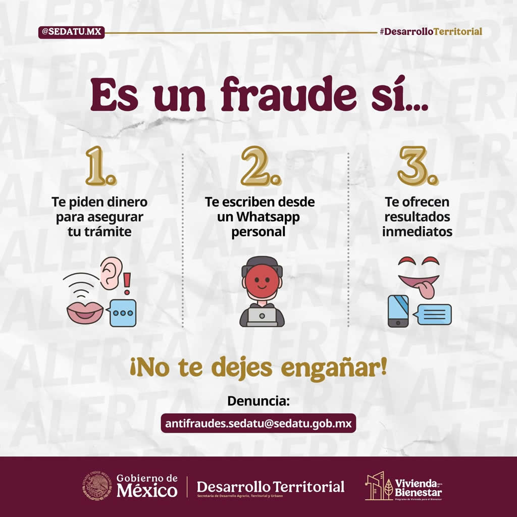 Para cualquier información comunicarse al correo institucional antifraudes.sedatu@sedatu.gob.mx, así como a las redes sociales oficiales de la dependencia.