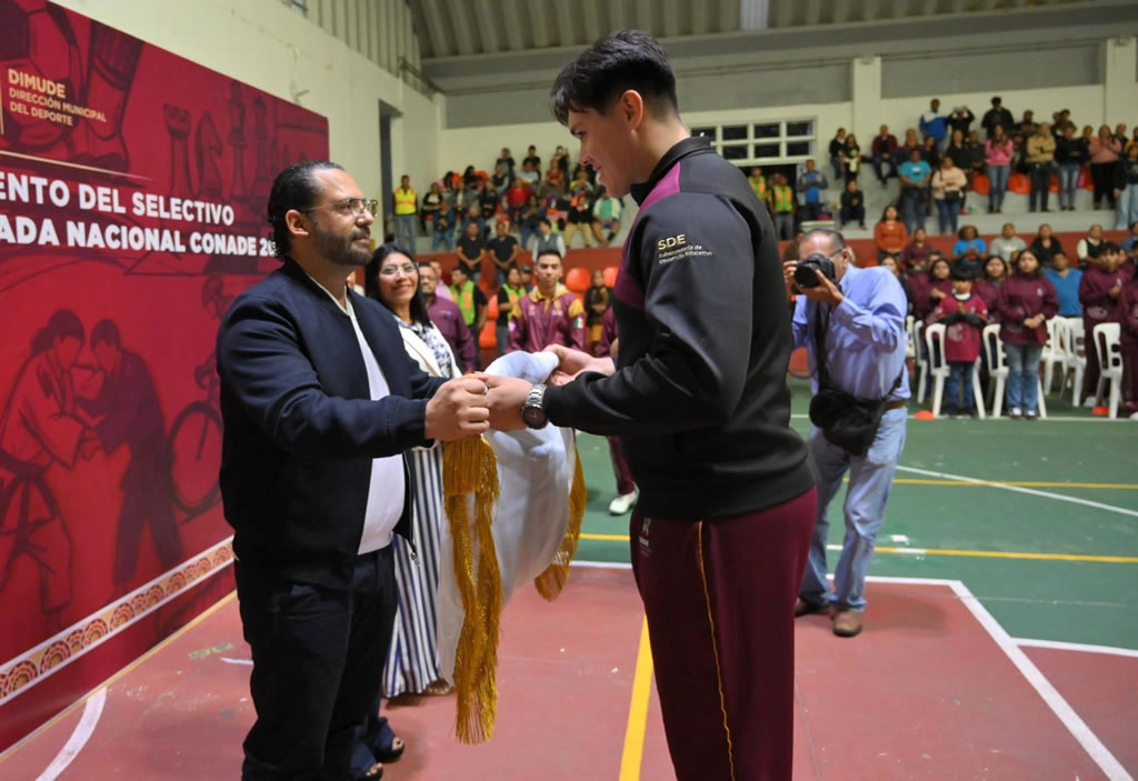 Como parte del acto protocolario, el alcalde entregó el estandarte a los medallistas nacionales de 2025: Samuel Valdivieso (Judo), Karime Paola Jiménez (Voleibol) y Briseydi Nahomi Montiel (TKD), quienes recibieron la bandera en representación de toda la delegación.