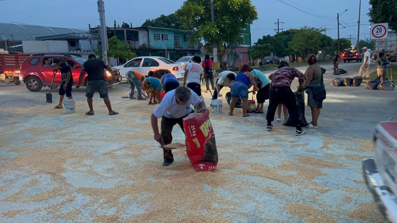 Enrique Burgos. Varias toneladas de maíz amarillo fue rapiñado por habitantes de la colonia Frutos de la Revolución, taxistas y conductores de Coatzacoalcos, justo en la portada sur de la Administración del Sistema Portuario Nacional (ASIPONA). El hecho se presentó aproximadamente a las 18:15 horas de este martes en la calle Primero de Mayo y
