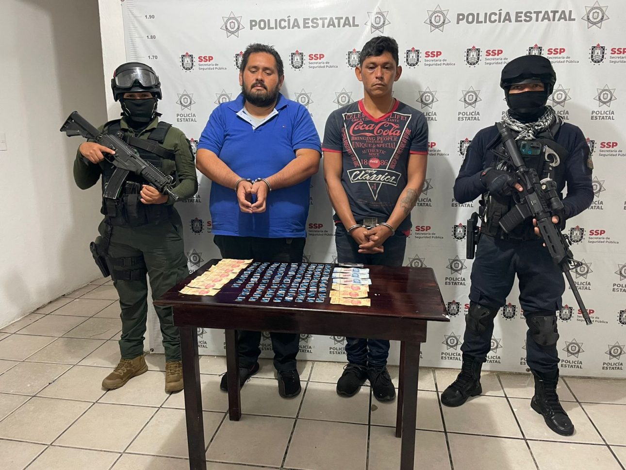 Elementos de la policia estatal lograron la detención de dos sujetos a quienes se les encontró en su poder una gran cantidad de dosis de cocaína y dinero en efectivo. Los detenidos son Jesus Roberto N. y Miguel Angel N., quienes viajaban a bordo del taxi 191 de esta ciudad y fueron intervenidos en la