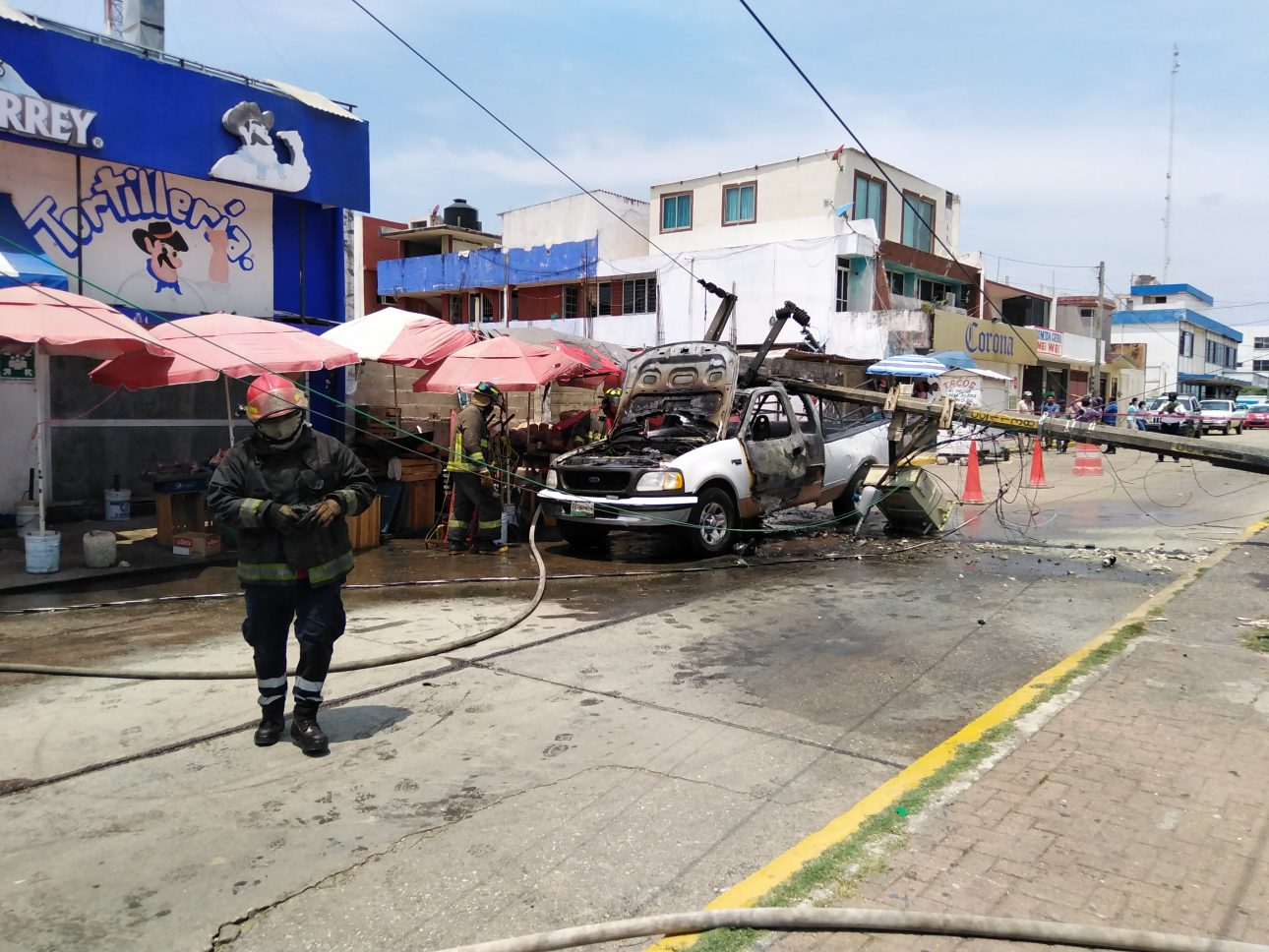Coatzacoalcos, Ver. Un camión de limpia pública marcado con el número LP 230, derribó un poste de concreto y provocó el incendio de una camioneta a un costado del mercado Morelos, no se reportaron personas lesionadas, solo daños materiales. Los hechos acontecieron alrededor de las 12:00 horas de martes sobre la avenida Juárez entre Pedro