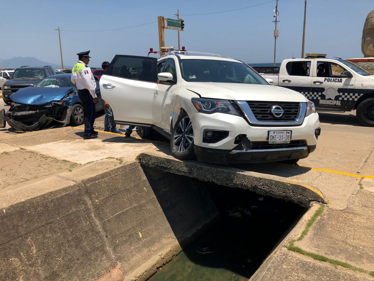 Coatzacoalcos, Ver. Dos personas con lesiones menores, quienes rechazaron ser atendidas por los cuerpos de emergencias y daños materiales que se calcula rebasa los 100 mil pesos, dejó como resultado un aparatoso accidente entre dos vehículos particulares ocurrido en la glorieta del malecón costero y la avenida Las Palmas. Las unidades que chocaron en ese