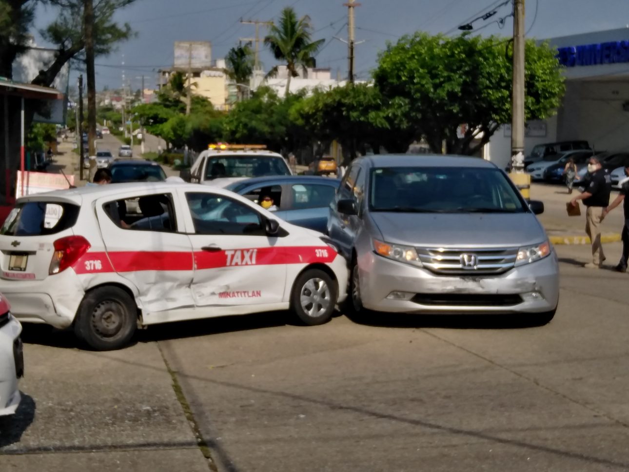 Tres personas resultaron lesionadas afortunadamente no de gravedad, en un aparatoso accidente ocurrido alrededor de las 12:00 horas de este miércoles, en la esquina de la avenida Miguel Hidalgo e Ignacio Aldama de la zona centro de la ciudad, donde chocaron dos taxis y una de estas unidades terminó volcada con los neumáticos hacia arriba.