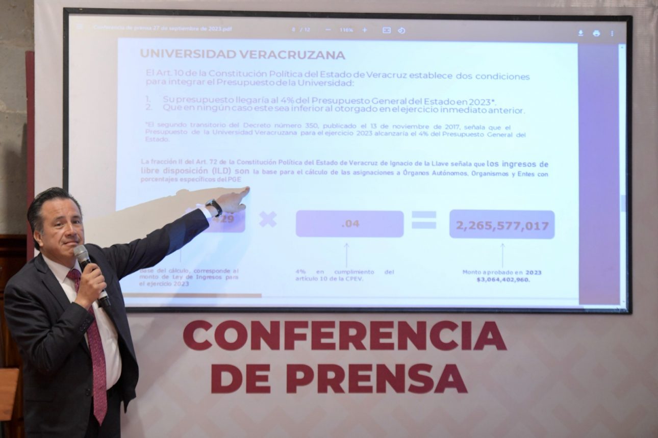 A nivel nacional, la Universidad Veracruzana (UV) es la única institución estatal de educación superior sin deuda, expresó el gobernador Cuitláhuac García Jiménez al informar que la administración ha cubierto el presupuesto en mayor medida de lo que indica la ley, que es del 4 por ciento. Dado que existen dos interpretaciones sobre el financiamiento,