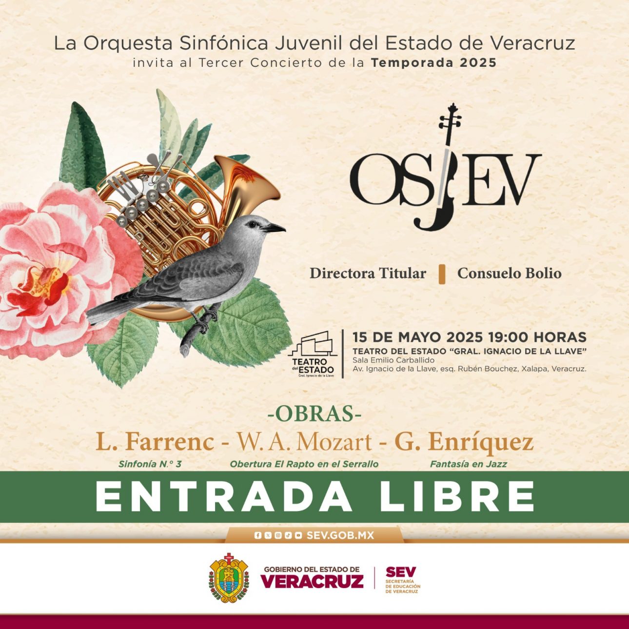 La Secretaría de Educación de Veracruz (SEV), en colaboración con la Secretaría de Cultura (SECVER), invita al Tercer Concierto Temporada 2025 de la Orquesta Sinfónica Juvenil del Estado de Veracruz (OSJEV), que se realizará este jueves 15 de mayo, a las 19:00 horas, en la sala Emilio Carballido del Teatro del Estado. Bajo la dirección