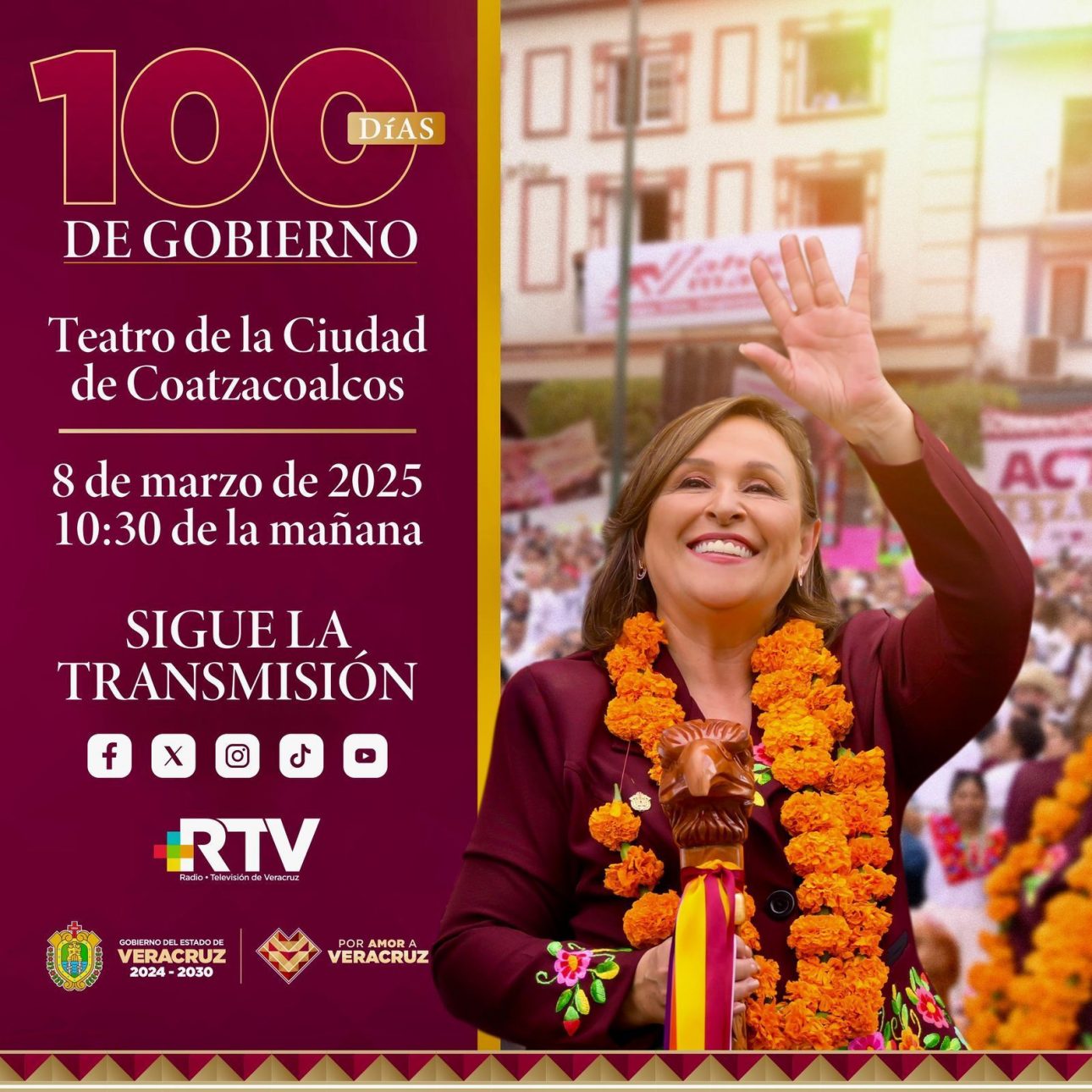 La gobernadora de Veracruz, Rocío Nahle García, rendirá su Informe de los primeros 100 días de actividades, el próximo sábado 08, en el Centro de Convenciones y Teatro de la Ciudad de Coatzacoalcos. La cita es a las 10:30 de la mañana, donde presentará un balance de las acciones emprendidas en este periodo para el