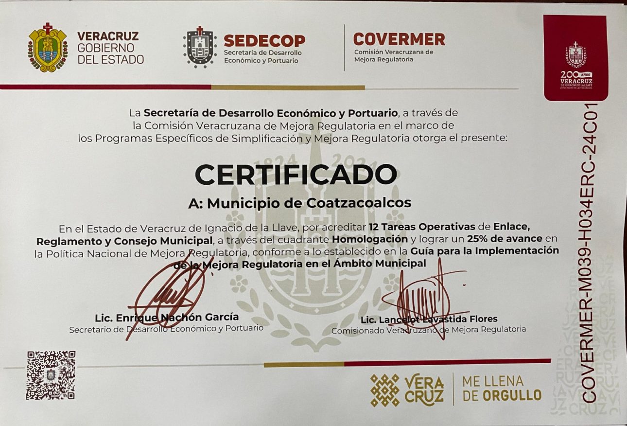 El presidente municipal de Coatzacoalcos, Amado Cruz Malpica, participó en la décimo séptima sesión ordinaria del Consejo Estatal de Mejora Regulatoria, presidida por el gobernador Cuitláhuac García Jiménez. Durante la sesión, el munícipe recibió el Certificado del Programa de Especificación para la Simplificación y Mejora Regulatoria dirigido a dependencias, instituciones y ayuntamientos. El evento celebrado