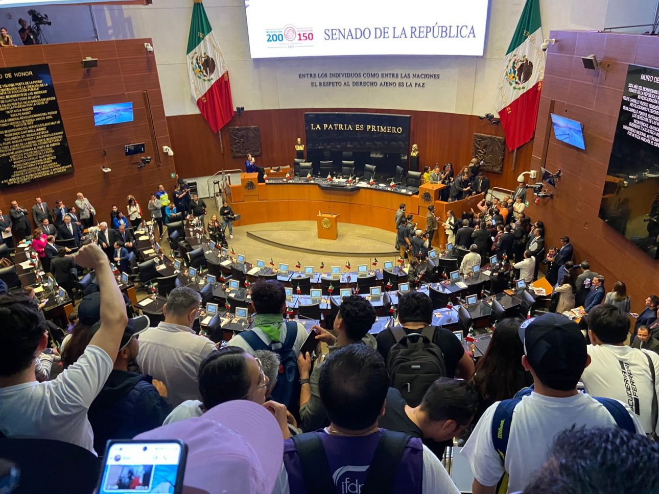 Cientos de manifestantes irrumpieron en el Senado de la República para protestar contra la reforma judicial, mientras en el recinto legislativo se realizaba la sesión en la que se debate el dictamen. Al grito de “¿en dónde están? ¿en dónde están?, los senadores que nos iban a escuchar”, “traidores” y “el Poder Judicial no va