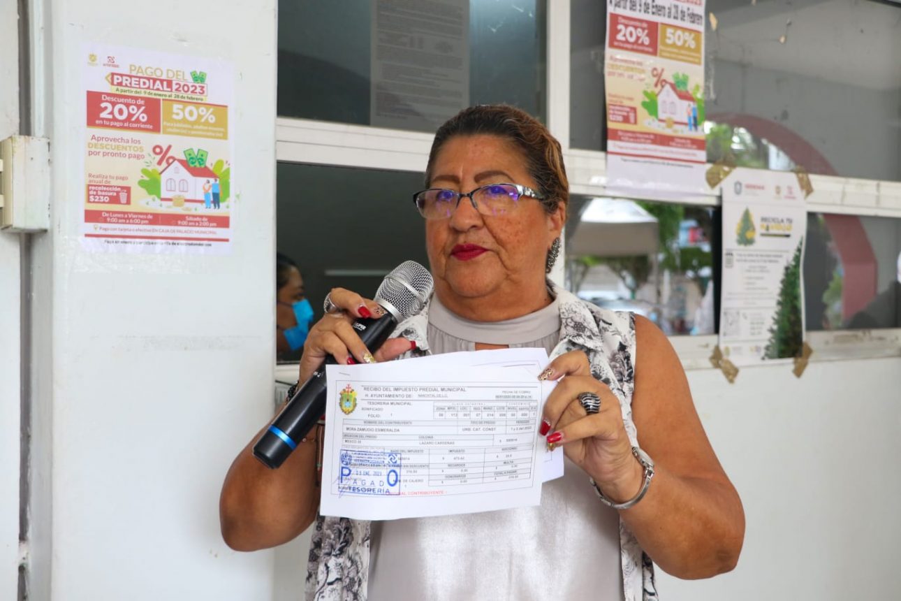 Con buena participación de la ciudadanía, esta mañana inició de manera formal y en orden, el cobro del Impuesto Predial 2023, en la caja ubicada en la planta baja del Palacio Municipal, frente al Parque Central Benito Juárez Fue la Alcaldesa Esmeralda Mora Zamudio, quien llevó a cabo el primer pago, para posteriormente dar arranque