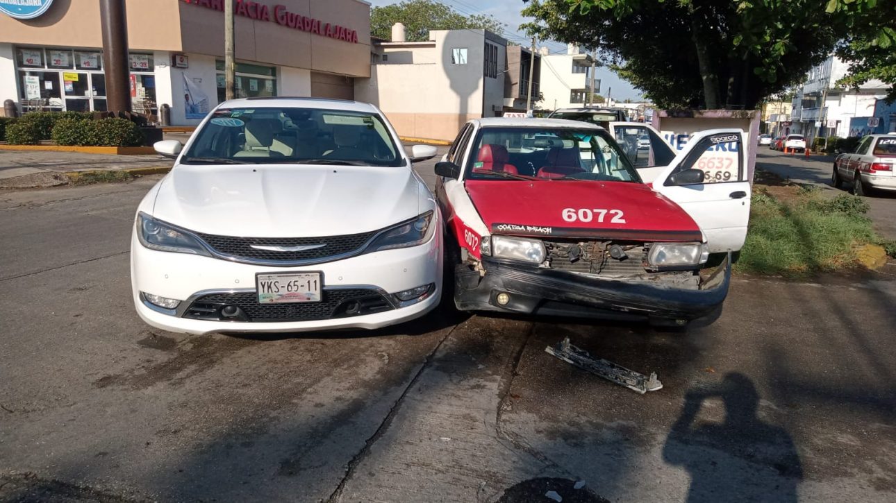 Coatzacoalcos, Ver. Un vehículo particular y el taxi marcado con el número 6072 chocaron en la esquina de la avenida Juan Escutia y Ayuntamiento de la colonia Benito Juárez Norte donde no se reportó personas lesionadas,, unicamente daños materiales. Los hechos acontecieron durante la mañana de este jueves y los perjuicios materiales fueron calculados en