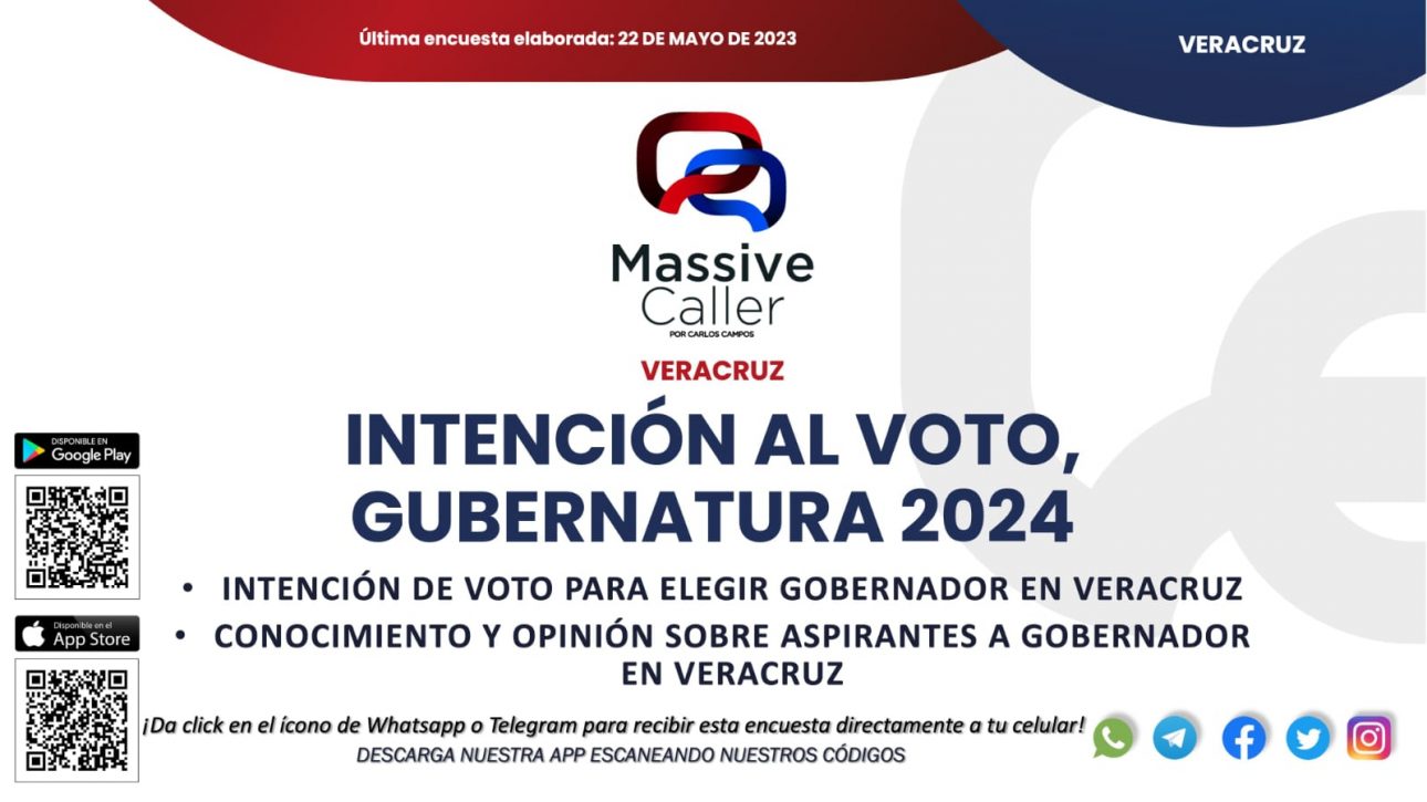 La secretaria de Energía, Rocío Nahle, y Morena encabezan las preferencias entre el electorado veracruzano para la próxima elección de 2024. Así lo muestra una encuesta realizada por la firma Massive Caller el 22 de mayo de 2023 sobre la intención del voto para la gubernatura. Dicha encuesta muestra los resultados de las respuestas dadas